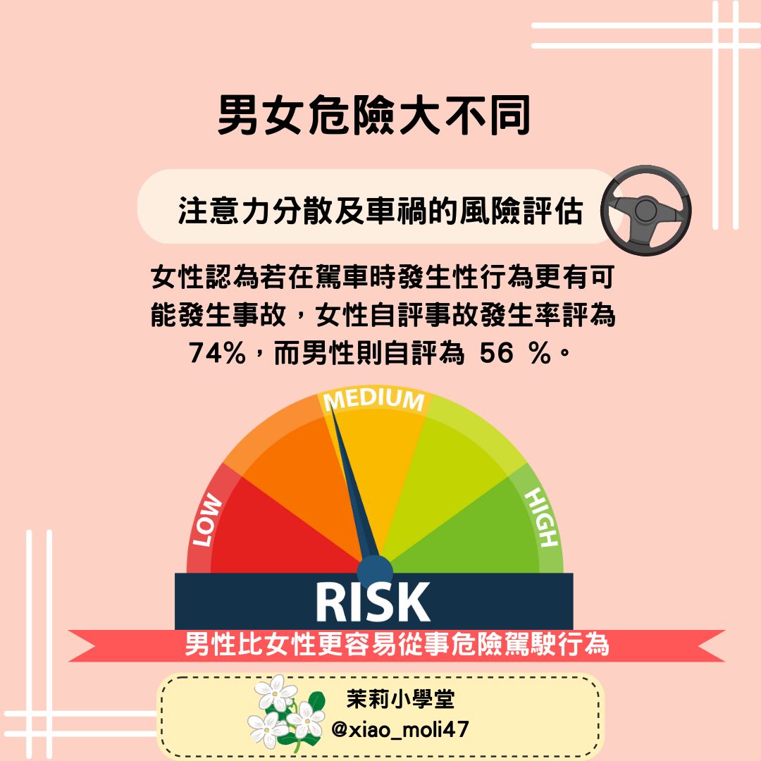 男性比女性更容易從事危險駕駛行為,開車時分心都會使車禍風險增加 2倍。